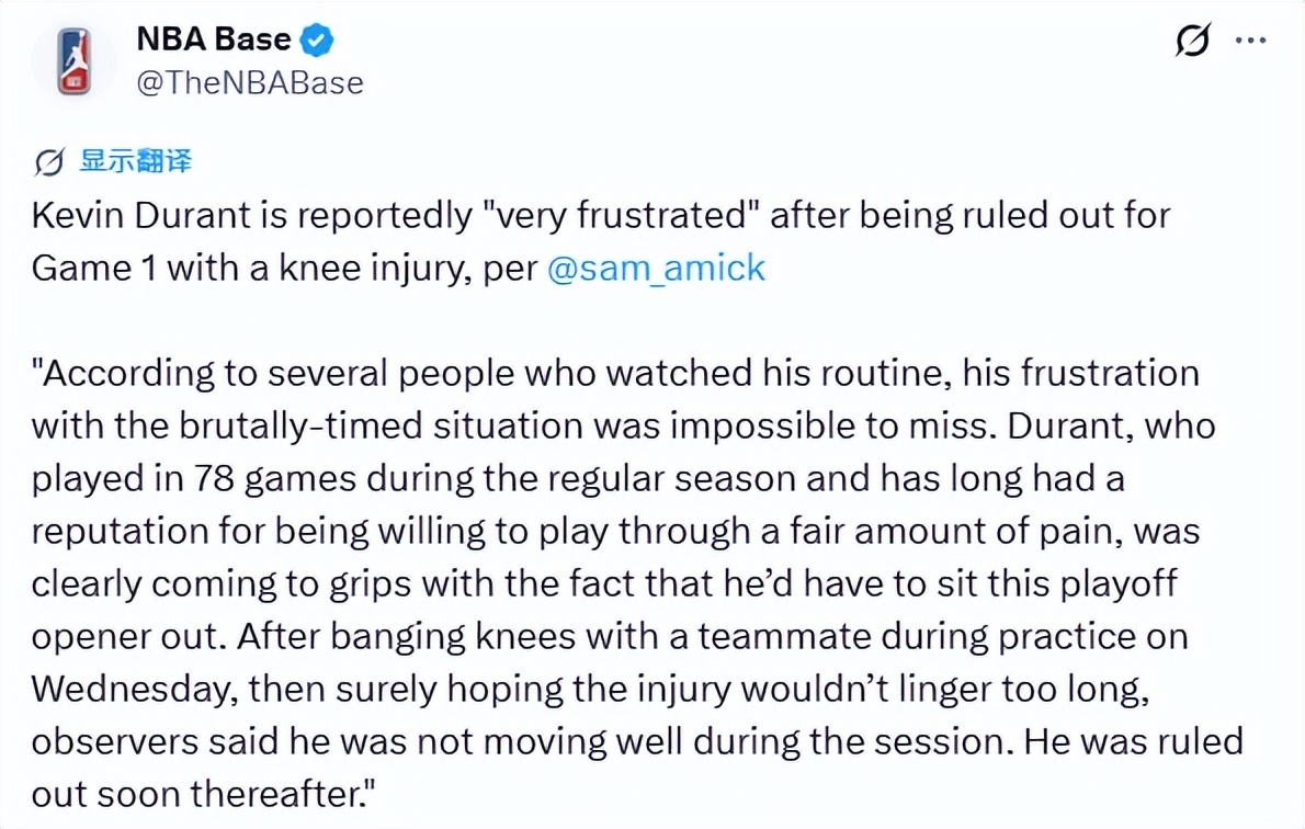 Amick报道说,赛前大约两小时,杜兰特上场尝试活动受伤的膝盖,即使不经医疗检查也能明显察觉,他伤势显著、状态很差,满脸痛苦神色。