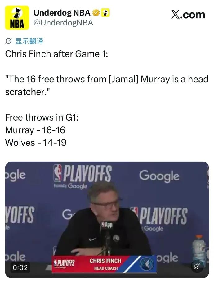 森林狼主教练芬奇对穆雷获得16次罚球机会颇为不满,称这一情况令人难以理解。