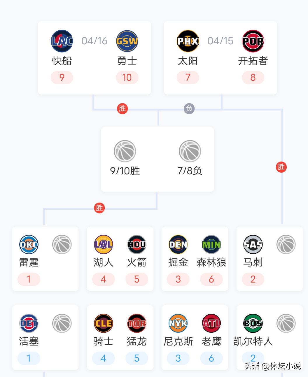 至此西部季后赛对阵已确定,目前已有两组对决:第四的湖人对阵第五的火箭,引爆流量的“火湖大战”;第三的掘金对阵第六的森林狼。卫冕冠军雷霆的对手来自附加赛,马刺的对手亦来自附加赛。附加赛对阵为快船大战勇士,此组败者直接出局,胜者需再赢一场方能锁定季后赛席位。而太阳对阵开拓者的胜者将直接晋级季后赛,败者仍有一次冲击季后赛的机会!