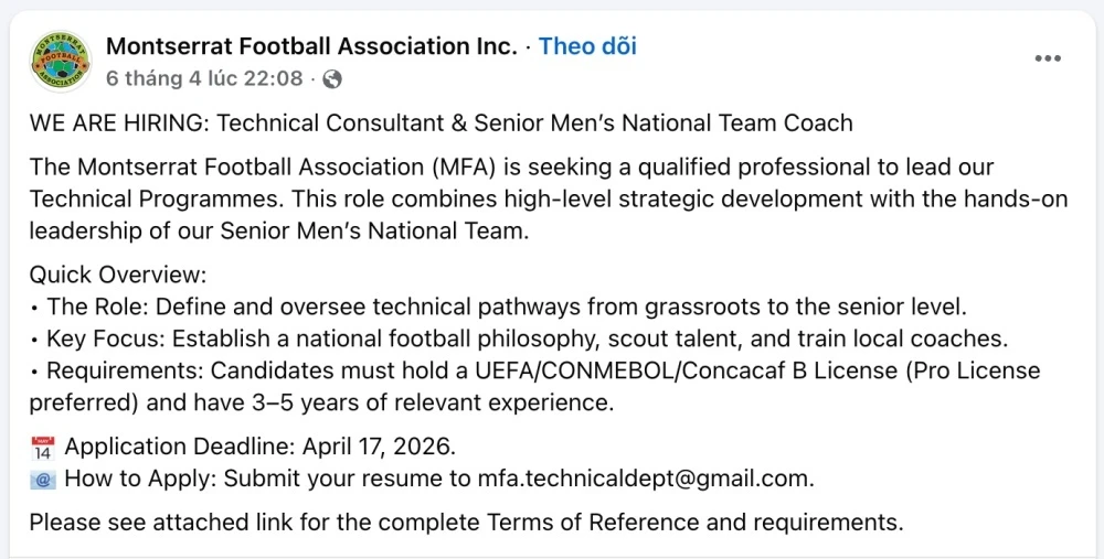 在现代足球世界中, 任命主教练一事 通常是秘密谈判或通过知名球员经纪公司运作的结果。然而,蒙特塞拉特足球协会(MFA)决定打破所有传统规则,在其官方Facebook页面上直接发布了招聘国家队男子主教练职位的公告。