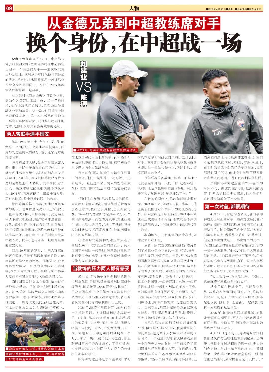 记者王伟报道 4月17日中超第六轮,深圳新鹏城主帅陈涛将在赛场上面对一位熟悉的老对手——重庆铜梁龙主帅刘建业。这对自幼便携手奋斗的战友,一同走过从沈阳五里河训练到长沙金德的风雨历程,2023年还曾在深圳队教练组共同工作。